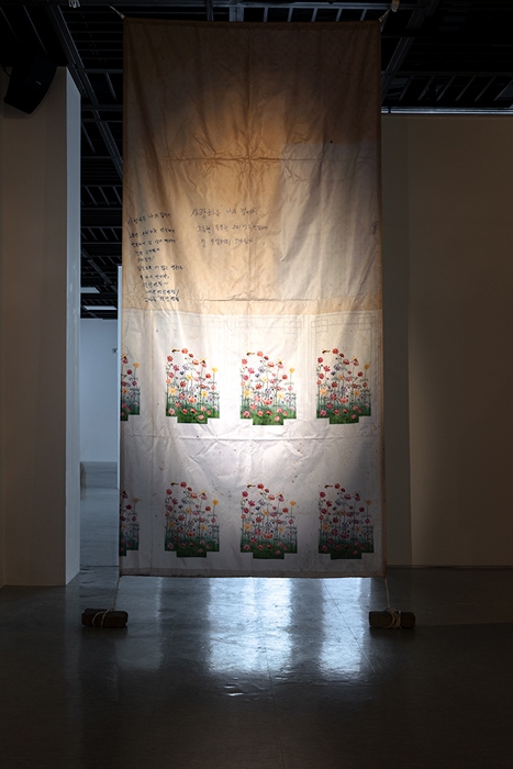 이 작품은 철거가 시작된 지역의 한 연립주택 거실 벽에 써있는 문구를 찍은 사진현수막 작업이다. 벽에는 “사랑하는 나의 집에게, 그동안 우리 가족 건강하게 행복하게 잘 살게 해주어서 정말 고마웠다. 우리집아! 앞으로도 더 많은 행운으로 또 다시 만나자. 덕산연립~ 그리운 덕산연립! 고마운 덕산연립”이라고 적혀있다. 한 지역이 재개발 추진 및 확정 등이 이루어지면 언제나 골목마다 현수막이 걸리는데서 착안한 작품이다.